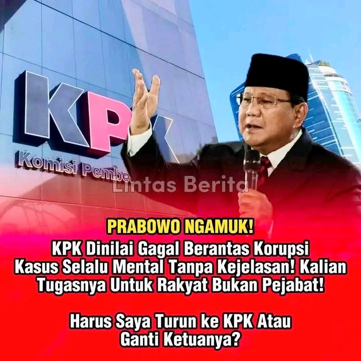 Pemberantasan Korupsi (KPK). Dengan nada tegas, Prabowo menilai KPK gagal menjalankan tugasnya sebagai lembaga pemberantas korupsi yang seharusnya bekerja untuk kepentingan rakyat, bukan untuk melindungi pejabat.
